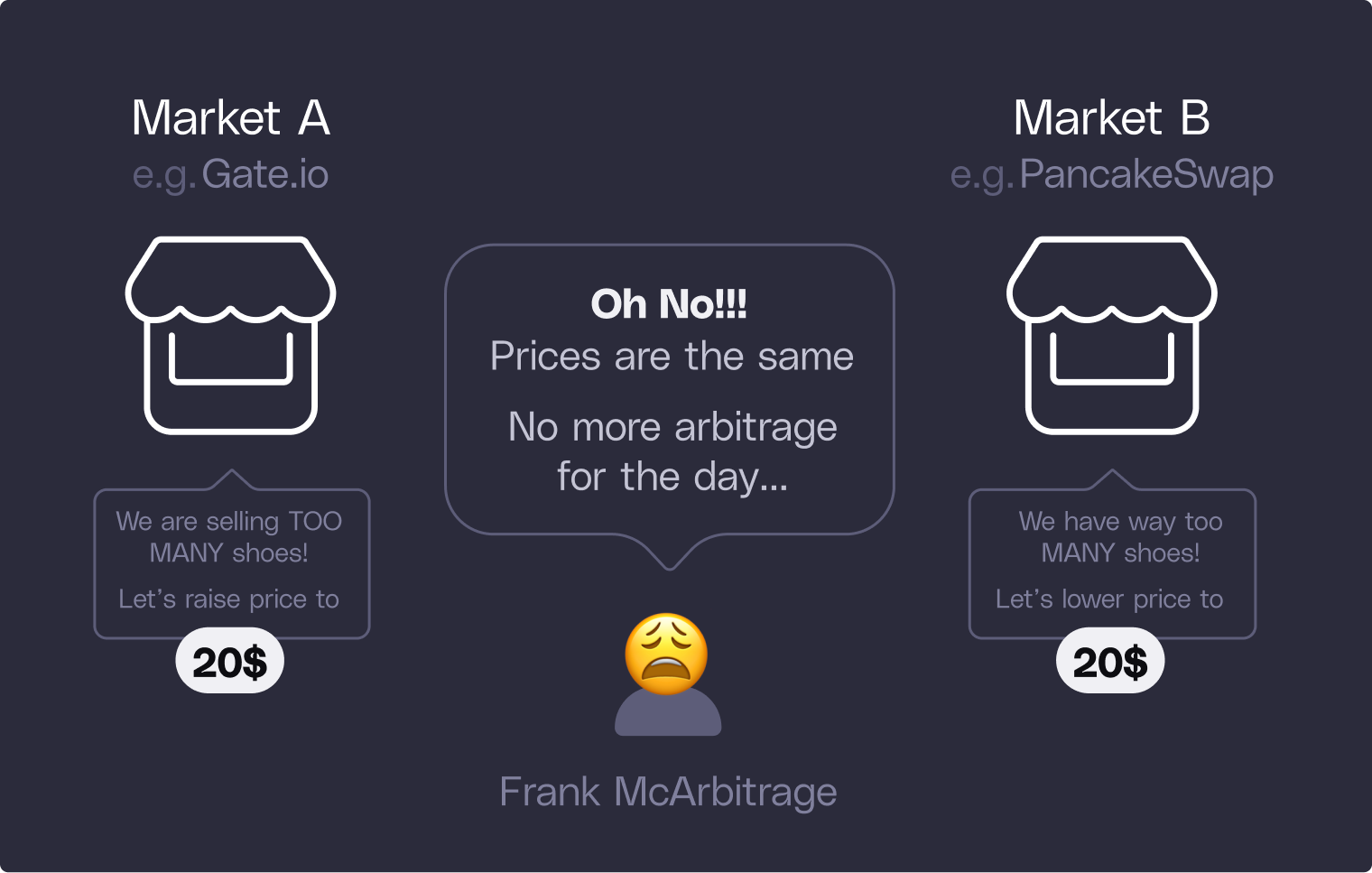 This action balances the supply and price disparity across the two shops, situated on opposite sides of the world, while you, the arbitrageur, profit from the process.